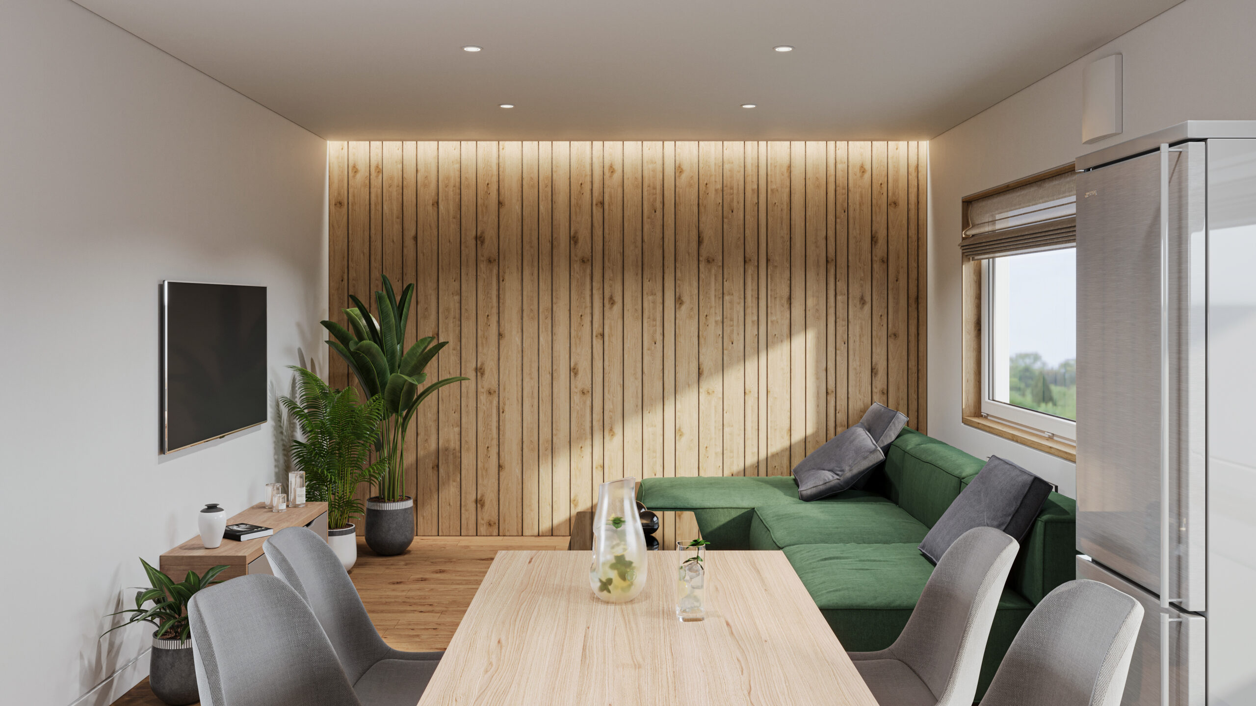 The UNOMOD-55 modular house in the basic configuration with external walls with thermal conductivity coefficient U-0.18 w/m2K, mineral wool insulation, and double-glazed windows with energy-saving glass with special spraying, inert gas, and remote-controlled energy-saving glazing bars allows you to significantly reduce energy consumption compared to houses of traditional construction.